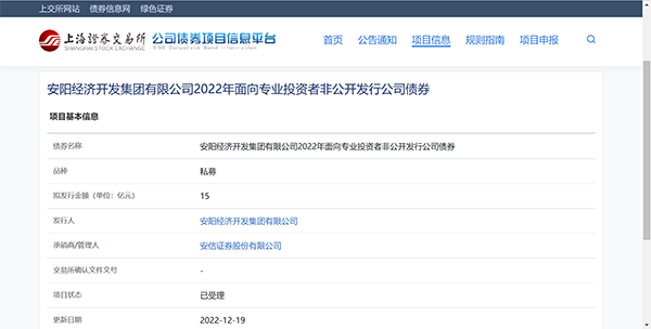 12月16日,集團(tuán)收到上海證券交易所通知,集團(tuán)報送的非公開發(fā)行公司債券并掛牌轉(zhuǎn)讓的申請,上交所按照相關(guān)規(guī)定已予受理。本期債券名稱為安陽經(jīng)濟(jì)開發(fā)集團(tuán)有限公司2022年面向?qū)I(yè)投資者非公開發(fā)行公司債券,品種為私募債,金額15億元,承銷商/管理人為安信證券。