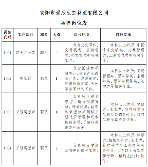 安陽市景欣生態(tài)林業(yè)有限公司(以下簡稱“景欣林業(yè)”)是安陽市國家儲(chǔ)備林建設(shè)PPP項(xiàng)目公司,根據(jù)工作發(fā)展需要,擬委托安陽鼎泰勞務(wù)派遣有限責(zé)任公司(以下簡稱“鼎泰公司”)面向社會(huì)公開招聘6名工作人員?,F(xiàn)將有關(guān)事項(xiàng)公告如下: