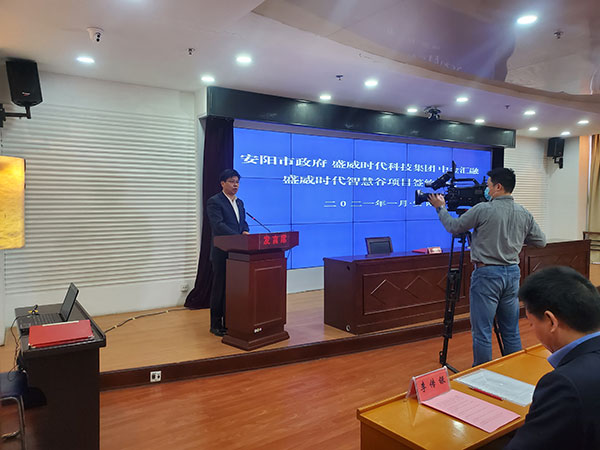 2021年1月13日上午,盛威時代智慧谷項目簽約儀式在市黨政綜合樓2樓第5會議室舉行,市政府、盛威集團(tuán)、安陽戰(zhàn)新基金、示范區(qū)管委會、經(jīng)開集團(tuán)等單位的主要領(lǐng)導(dǎo)參加簽約儀式。儀式由市政府秘書長李傳銀主持,常務(wù)副市長陳志偉代表市政府簽約,袁家健市長致辭,齊方董事長代表經(jīng)開集團(tuán)出席簽約儀式。
